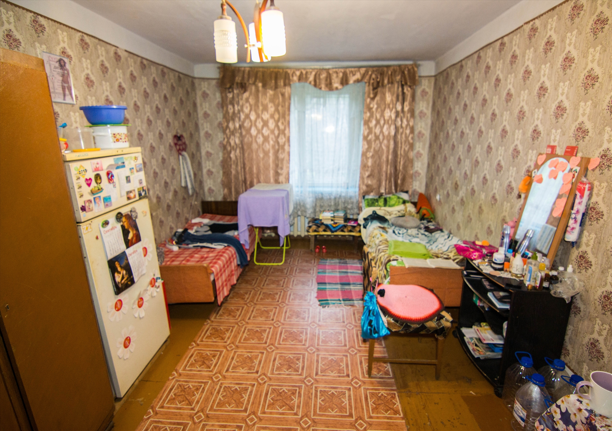 Комната закрывается на ключ. В комнате холодильник, 2 шкафа, 2 кровати, стол. В квартире все удобства, стиральная машина автомат на кухне.